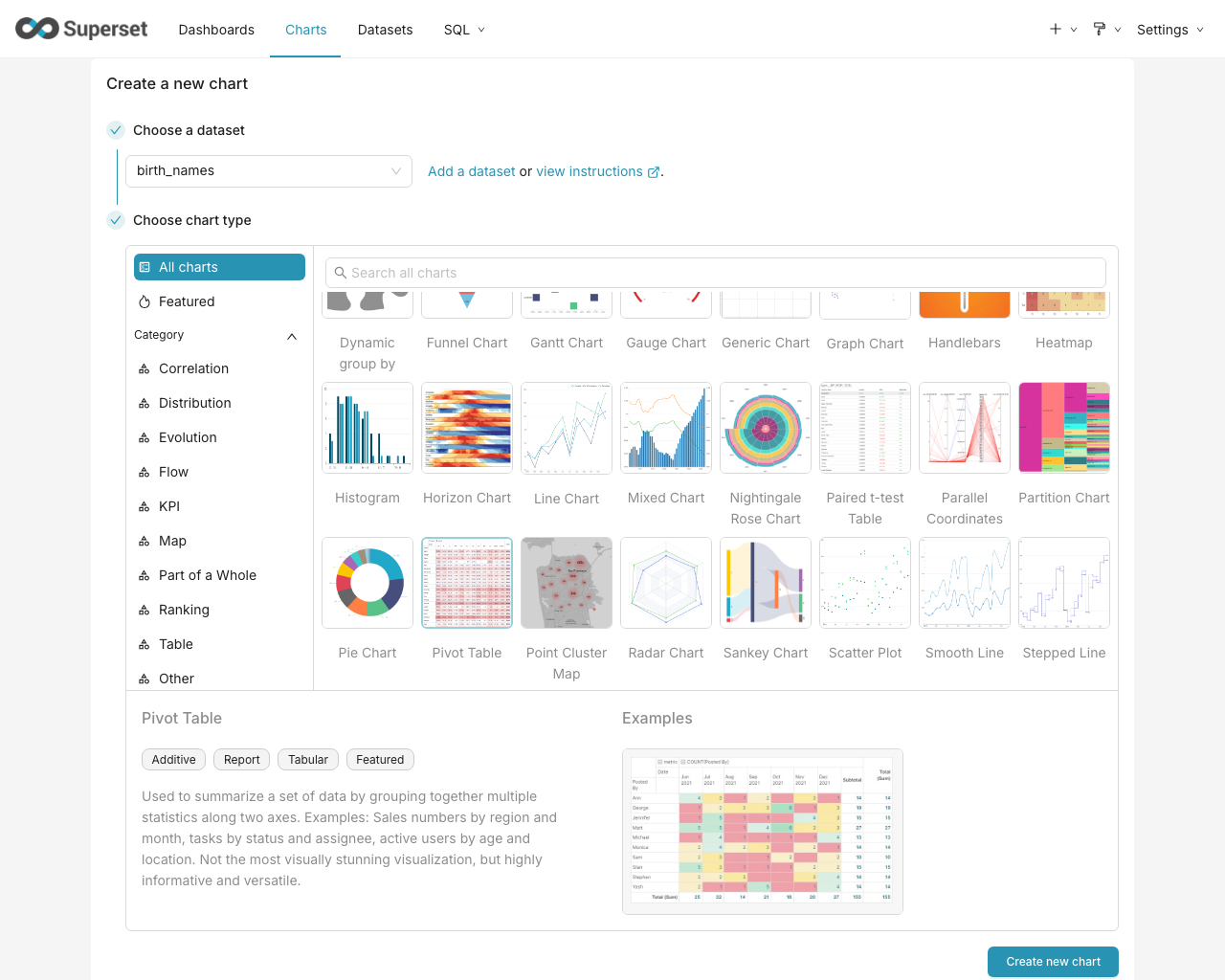 Create a new chart by selecting + ‣ Chart from the top right corner. Choose tutorial_flights again as a datasource, then click on the visualization type to get to the visualization menu. Select the Pivot Table visualization (you can filter by entering text in the search box) and then Create New Chart.